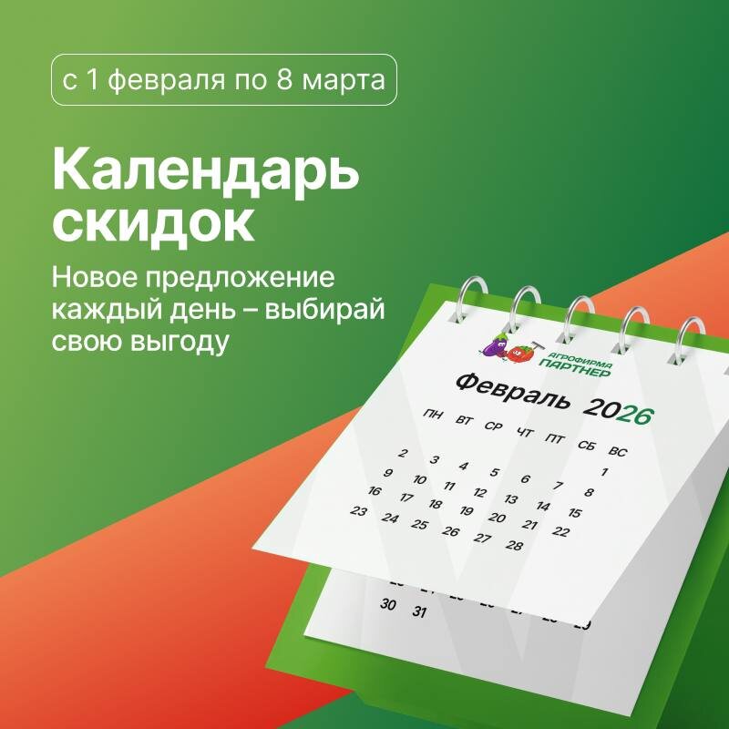 С 1 февраля в интернет-магазине Агрофирмы Партнер стартует Календарь скидок — акция, из-за которой хочется заглядывать в каталог каждый день. С 1 февраля по 8 марта вас ждет особый формат выгодных покупок: 🗓 каждый четверг мы раскрываем расписание скидок, чтобы вы заранее знали, когда и на какие категории товаров действуют выгодные предложения. Это отличная возможность спокойно спланировать покупки семян овощей и цветов и забрать нужное с пользой для бюджета 🪴 📌 Скидки первой недели: 1 февраля — скидка −10% Морковь · Дельфиниум · Петрушка 2 февраля — скидка −10% Перец · Виола · Горох 3 февраля — скидка −15% Лук (репчатый) · Примула · Рукола 4 февраля — скидка −10% Томат · Петуния · Товары для рассады 5 февраля — скидка −10% Свекла · Алиссум · Базилик 💡 Важно знать: — предложение не суммируется с другими акциями и специальными предложениями; — скидки действуют только в указанные даты. 👉 Заглядывайте в интернет-магазин каждый день, следите за календарем скидок и забирайте