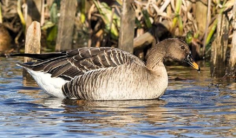 Гуменника местные зовут просто диким гусем. Окраска его оперения в основном серовато-бурая, зоб и грудь серые, подхвостье белое. На боках у взрослого гуся хорошо заметны светлые поперечные полосы, которых у молодых птиц нет, клюв у них короче, чем у взрослых, с незначительным распространением жёлтого цвета. От других, похожих на гуменника, «серых» гусей он отличается жёлтым или красноватым цветом клюва с чёрным основанием и таким же коготком (у собственно серого, белолобого гуся и пискульки клюв однотонно розовый или желтоватый с белым коготком, а у сухоноса клюв длинный, целиком чёрный), а также отсутствием белого пятна на лбу или белой каймы вокруг основания клюва. Ноги у гуменников желтоватые или красноватые. Пуховые птенцы желтовато бурые, более светлые на нижней стороне тела. Длина тела гуменника 70-90 см, а вес – 3-4,5 кг.