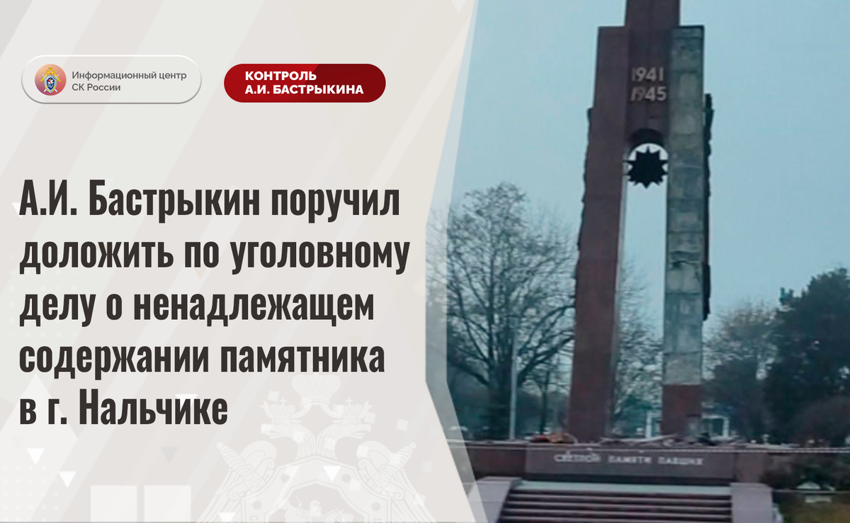 А.И. Бастрыкин поручил доложить по уголовному делу о ненадлежащем содержании памятника в г. Нальчике В сети Интернет сообщается о ненадлежащем содержании памятника, посвященного жителям города Нальчика Кабардино-Балкарской Республики, погибшим в годы Великой Отечественной войны. В январе текущего года, несмотря на проведенную ранее реставрацию, произошло обрушение части облицовочной плитки монумента, расположенного в сквере на улице Толстого. В СУ СК России по Кабардино-Балкарской Республике возбуждено уголовное дело. Председатель Следственного комитета Российской Федерации Александр Иванович Бастрыкин поручил руководителю СУ СК России по Кабардино-Балкарской Республике Андрею Михайловичу Фишману доложить о ходе и результатах расследования уголовного дела. Исполнение поручения поставлено на контроль в центральном аппарате ведомства. #СледственныйКомитет #СКРоссии #СК #ИЦСКР #ИнформационныйЦентр #АлександрБастрыкин #ПредседательСКР #КонтрольПредседателяСКР #КомментарийКонтроль #КБР