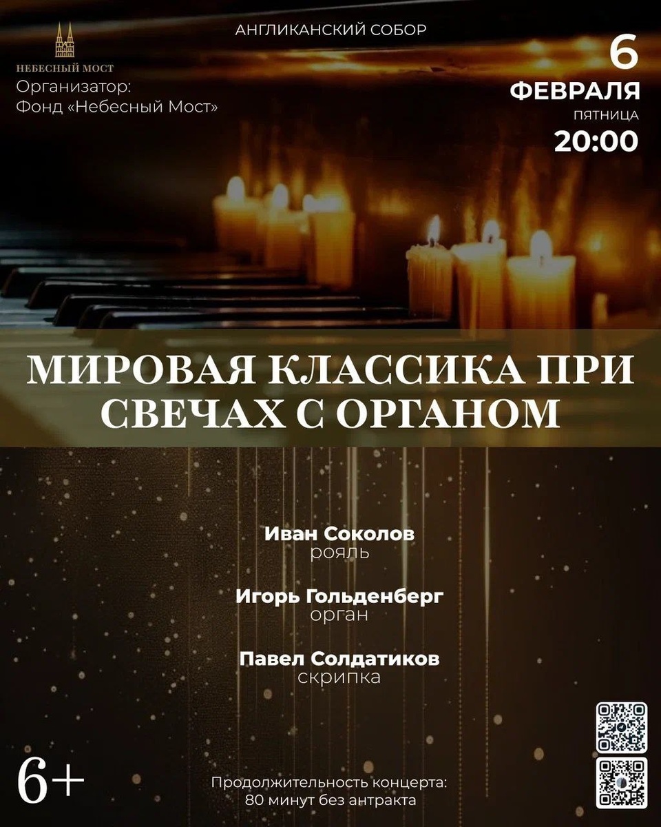 6 февраля 2026, пятница, 20:00 - концерт "Мировая классика при свечах с органом" - Англиканский собор - Афиша