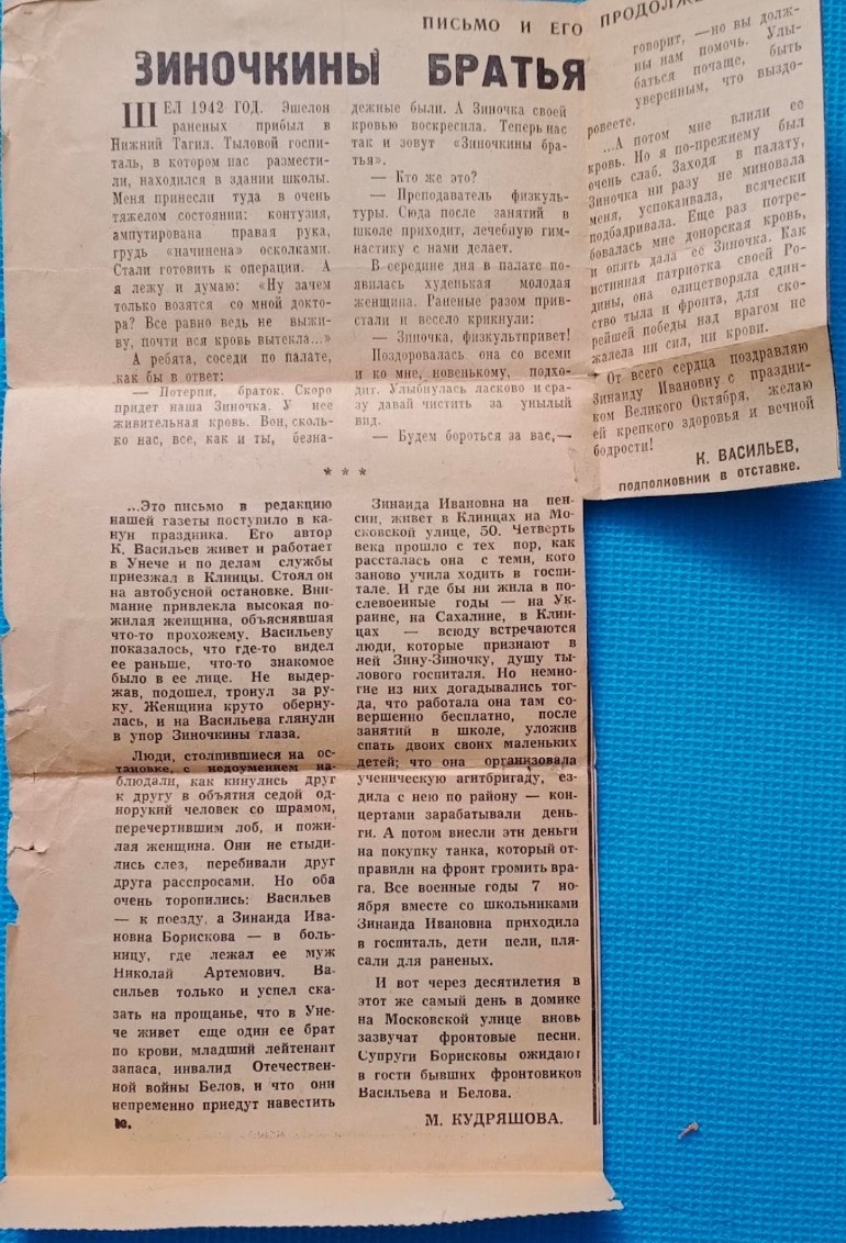 Подписчица нашего канала в Дзен Анна Баринова поделилась историей, сохранившейся в газетной вырезке. Её героиней стала Зинаида Ивановна Борискова, бабушка Анны. В годы Великой Отечественной войны она помогала раненным бойцам и командирам Красной Армии, находящимся на лечении в госпитале. Предлагаю читателям прочесть эту интересную и трогательную историю, а также посмотреть на фотографии Зинаиды Ивановны Борисковой и её мужа Николая Артемьевича Борискова, также упомянутого в статье.