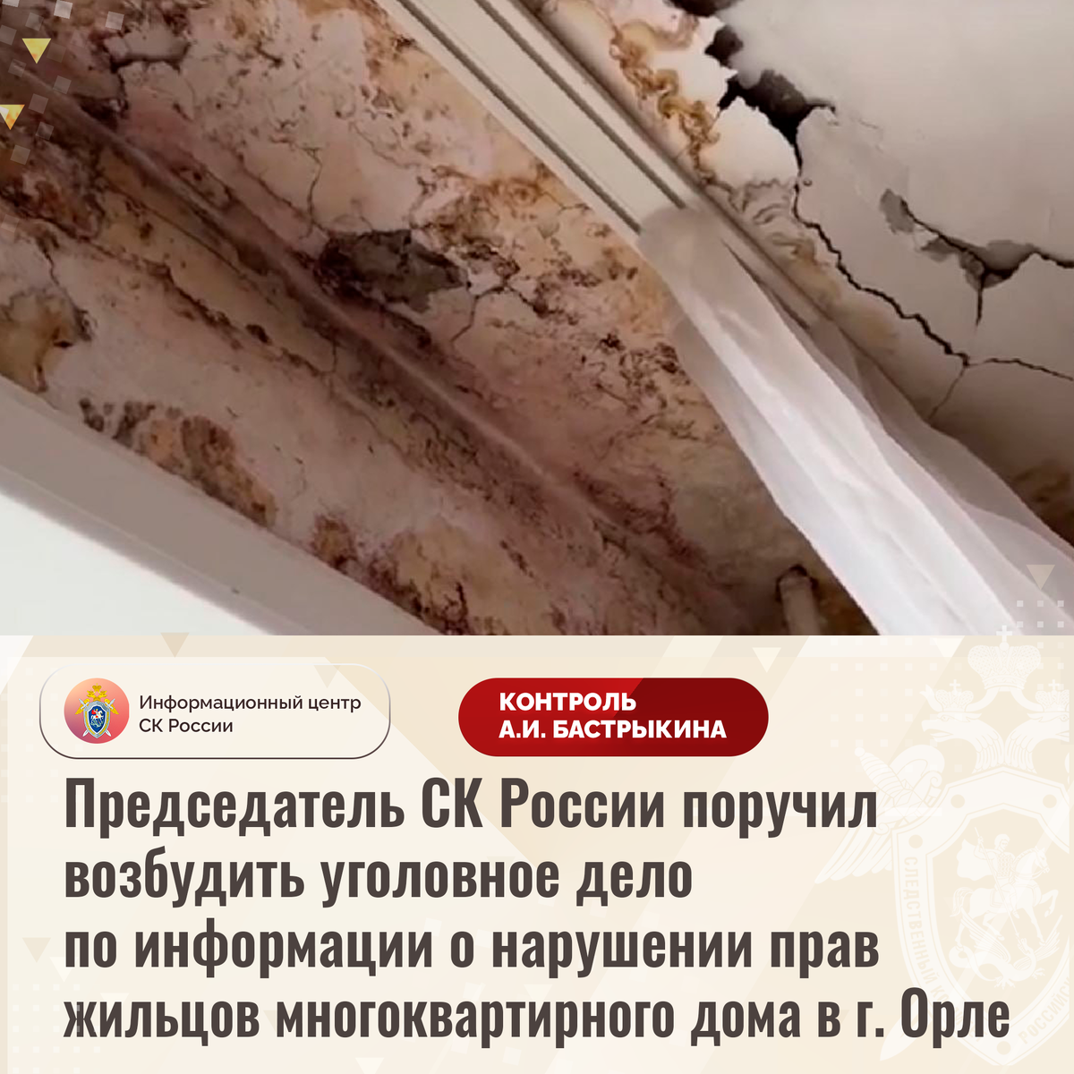 Председатель СК России поручил возбудить уголовное дело по информации о нарушении прав жильцов многоквартирного дома в г. Орле В СМИ и социальной сети сообщается о нарушении прав жильцов многоквартирного дома 1967 года постройки на улице Маринченко в городе Орле. На протяжении 15 лет из-за ветхого состояния балконных перекрытий и кровли во время осадков жилые помещения граждан затапливаются. Указанное приводит к появлению сырости и плесени, а также регулярному возникновению замыканий электрической проводки. Многочисленные обращения жильцов в профильные структуры результатов не принесли, капитальный ремонт строения запланирован только в 2027–2029 гг. В СУ СК России по Орловской области организована процессуальная проверка. Председатель Следственного комитета Российской Федерации Александр Иванович Бастрыкин поручил руководителю СУ СК России по Орловской области Александру Николаевичу Полшакову возбудить уголовное дело и представить доклад о предварительных и окончательных результатах ег