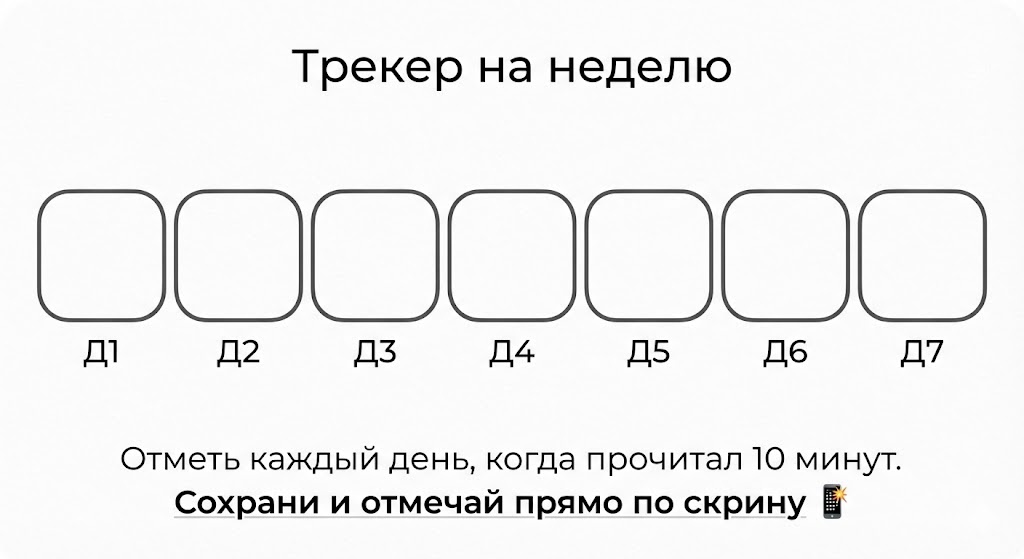 Инструкция к жизни на полях На картинке все честно и даже трогательно: сверху «Трекер на неделю», ниже семь пустых квадратиков, подписанных Д1–Д7, а внизу невинная просьба отмечать каждый день, когда прочитал 10 минут. Это такая современная икона самодисциплины: белый фон, тонкая рамка, и обещание, что жизнь наладится, если поставить галочку. И ведь правда, как не поверить листку, который говорит спокойнее любого психотерапевта и дешевле любого курса «Стань лучшей версией себя за три дня»? Десять минут как валюта Десять минут чтения сегодня звучат почти как инвестиция. Не в знания, нет. В редкий вид роскоши, который называется «тишина в голове». Потому что все вокруг продают внимание: соцсети берут его в аренду, новости берут в залог, мессенджеры берут в ипотеку. И тут появляется эта скромная сделка: отдай книге десять минут, получи право поставить отметку. Отметка, конечно, приятнее книги. Отметка мгновенная. Книга требует, чтобы ты был живым. Квадраты, KPI и святая галочка Семь квадр