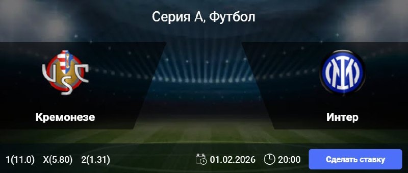 Статистика Кремонезе: Тотал меньше: В 7 из 9 последних игр чемпионата с участием «Кремонезе» забивалось не более 2 голов. Домашний фактор: Несмотря на общие проблемы, дома команда упирается: всего 3 поражения в 10 матчах (при 2 победах и 5 ничьих). Гол дома: В 6 из 8 последних матчей на «Джованни Дзини» хозяевам удавалось отличиться. Статистика Интера: Быстрый гол: Миланцы открывали счет в 9 из 10 последних игр. Доминация на выезде: Серия из 6 гостевых побед подряд. Надежность в гостях: В 4 из 5 последних выездов «Интер» сыграл «на ноль». 🎯 П1 и ТМ (3.5) 🎲 кф (1.95) 👉 СДЕЛАТЬ СТАВКУ 🎁 ФРИБЕТ WINLINE - 3000₽ (промокод: BETWIN) 👉 СМОТРЕТЬ ПРОГНОЗ