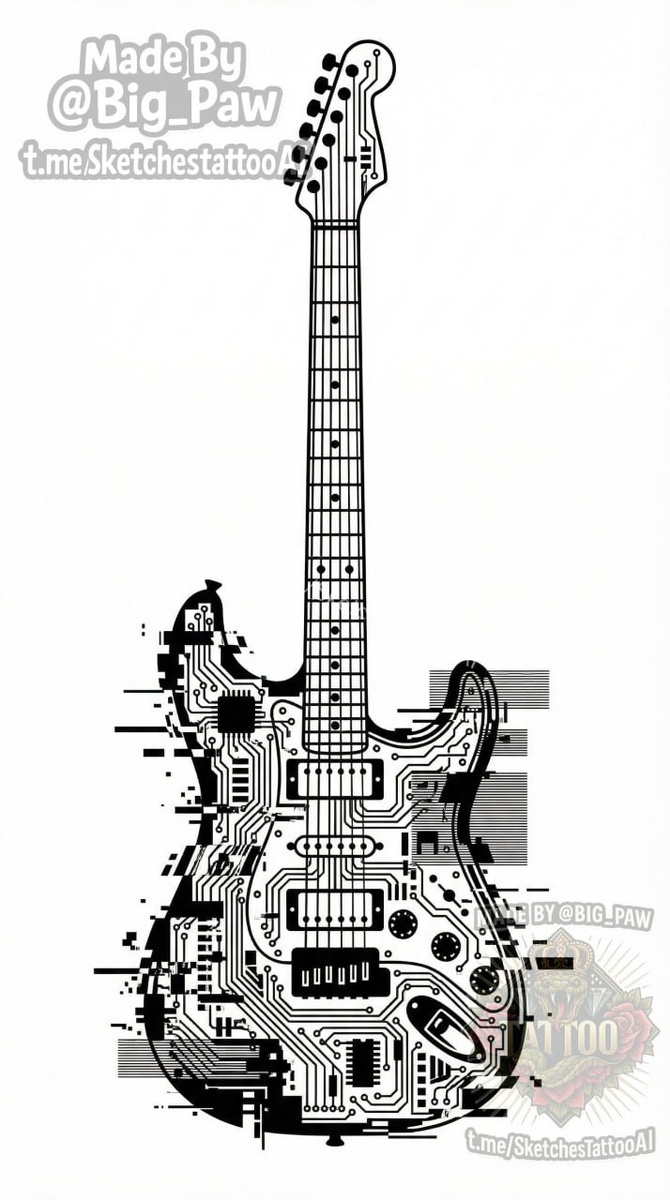 ? Линии электросхем, переходящие в электрогитару. По возможности, в некоторых вариантах добавить глитч эффект. 🧠 SYNTX - тут создан эскиз 💎 Информация - все услуги 💀 Эскизы от нейросети 😎 Удалить тату - прайс #гитара #музыка #техно #эскиз #тату #татуировка