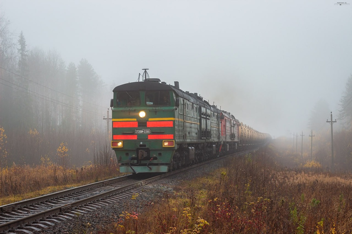 2ТЭ10М-2280 туманным утром на перегоне Гирсово — Медянка 17.10.2017