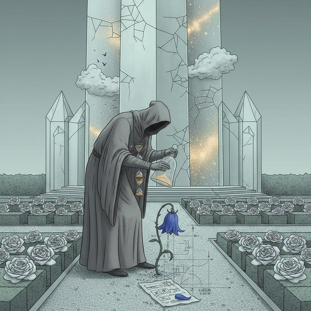 Хранитель Застывших Часов В одной далёкой стране, где тени ложились строго под углом девяносто градусов, а реки текли по расписанию, жил Хранитель Застывших Часов. Звали его Хрон. Он не был ни злым, ни жестоким — он просто любил порядок больше жизни. Его королевство было идеально: каждое дерево росло ровно на своём месте, цветы распускались по свистку, а птицы пели гаммы, а не песни. Сам Хрон обитал в башне из прозрачного хрусталя, откуда видел каждый уголок своих владений. Стены его комнаты были усеяны бесчисленными циферблатами, стрелки которых тикали в безупречной синхронности. Но самыми главными были не они, а маленькие песочные часики, висевшие на шее у Хрона. В них пересыпалась золотая пыльца времени — искра жизни его королевства. Однажды утром, проверяя график выпадения росы, Хрон заметил нечто непозволительное. На краю Безупречного Сада, там, где по плану должен был цвести строгий ряд тюльпанов, пробился один-единственный синий колокольчик. Он был кривоват, лепестки его трепета