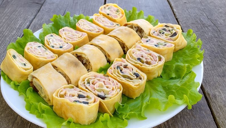 Идея для завтрака или закуски: четыре рулетика с разной начинкой на одной сковороде