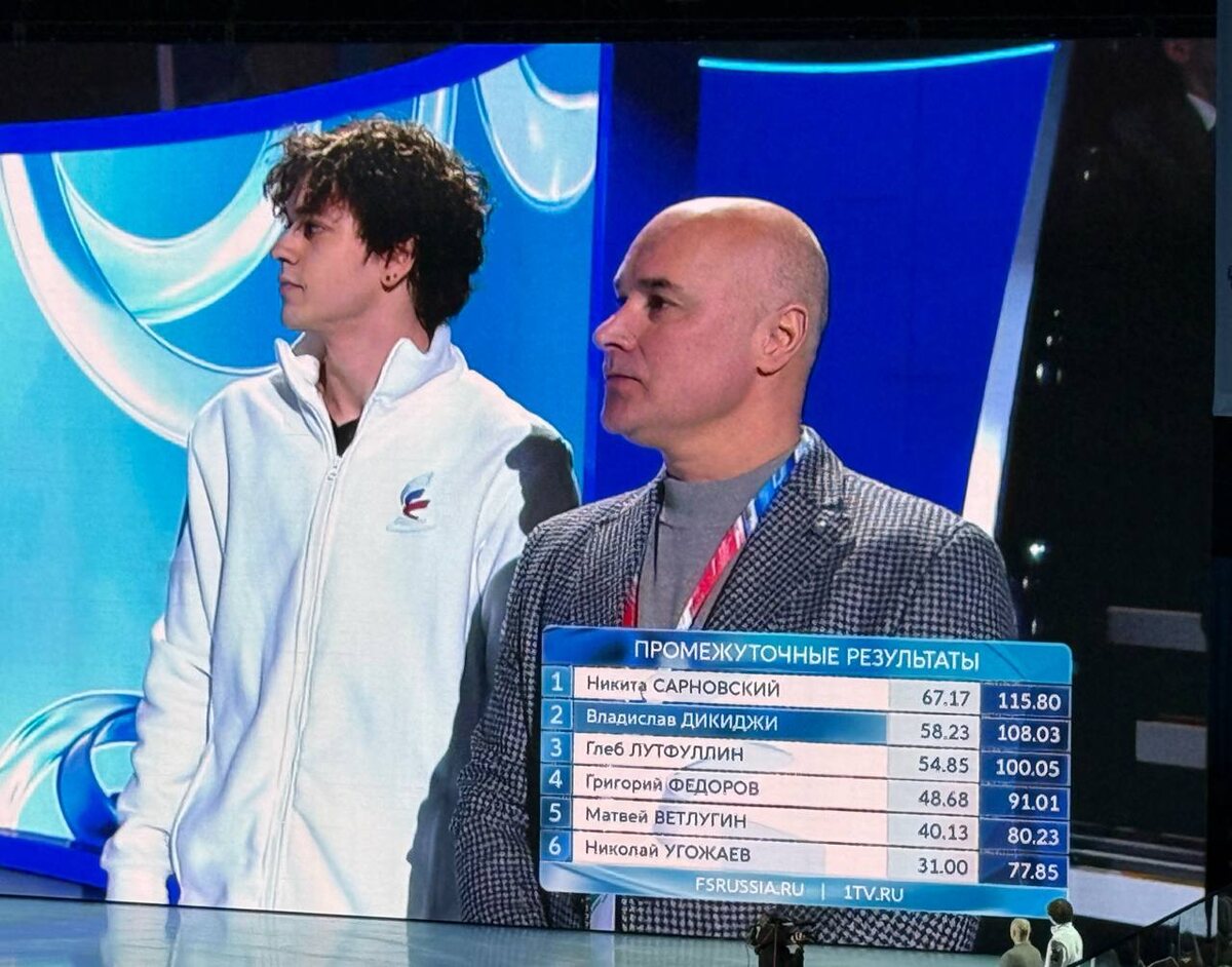 31,00 / 77,85 балла. Никита Сарновский очень уверенно заходит на прыжки. Евгений Плющенко сдерживает темп спортсмена во избежание ошибок.