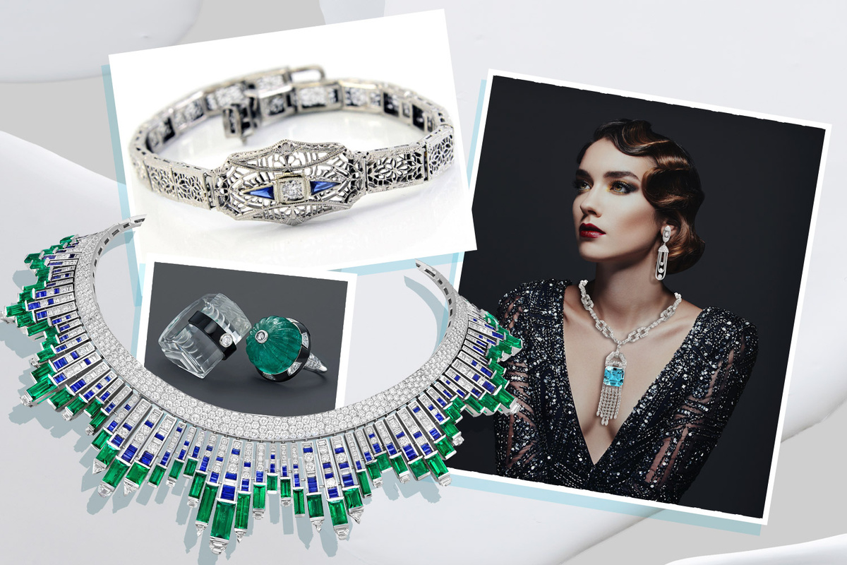 Ювелирные изделия ар-деко Эта поразительная эпоха декаданса, джазовых вечеринок и роскошного гламура, а также промышленного прогресса в науке и технике, оставила значительный след в ювелирном искусстве, определив его дальнейшее развитие на многие годы вперёд. Новый стиль возник в центре Парижа между двумя мировыми войнами и стремился воссоздать иллюзию благополучной и беззаботной жизни для поколений, пострадавших от военных конфликтов. Ар-деко представляет собой стиль, наполненный намеренной роскошью и солидностью, ориентированный на "средний класс". Ювелирная мода приобрела более откровенные, дерзкие и выразительные формы, заменив прежнюю мягкость линий геометрическими элементами. Ювелиры начали применять прямые линии, яркие оттенки и драгоценные камни, комбинируя платину с белым золотом. В дополнение к традиционным изделиям появились необычные экзотические украшения, вдохновленные путешествиями мастеров. Специалисты мастерски объединили в своих работах мотивы из Египта, Персии, Индии
