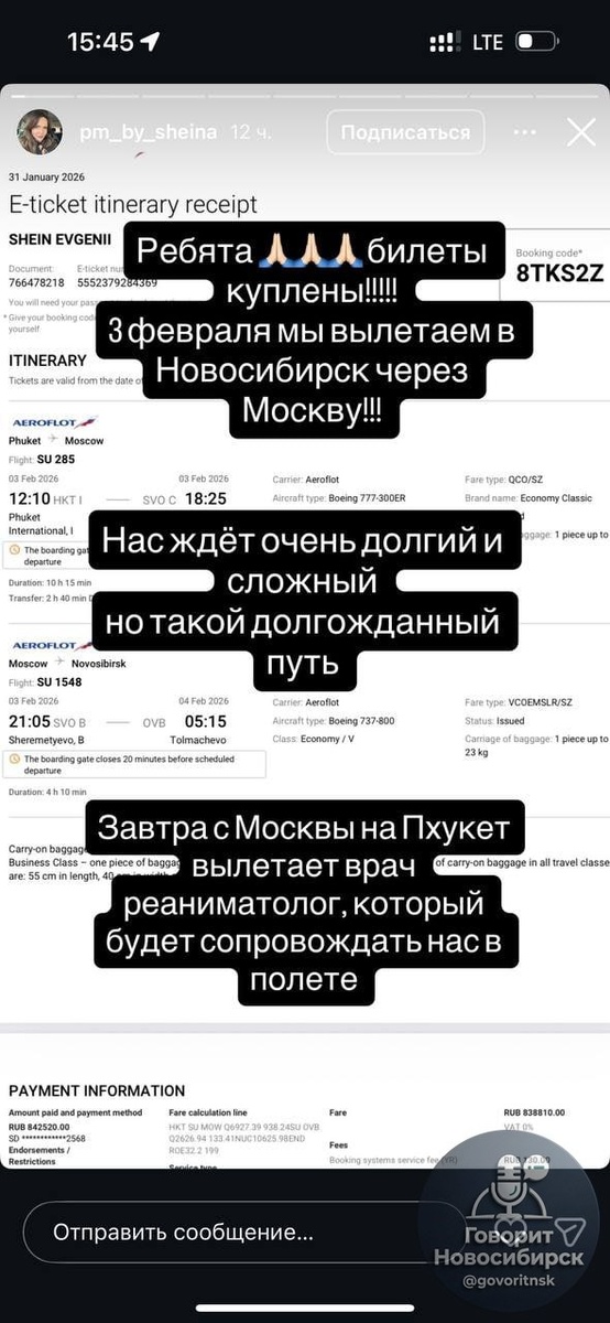 В момент отчаянного положения ситуацию спас бизнесмен Алексей Андрюнин, полностью оплативший сложную транспортировку Евгения, страдающего синдромом Гийена-Барре, которая обошлась примерно в 1,5 миллиона рублей. 3 февраля парализованного мужчину на специальных носилках с сопровождающим врачом из Медаэро-сервис доставят рейсами «Аэрофлота» в Новосибирск, где он сразу же будет госпитализирован. Мир не без добрых людей. Говорит Новосибирск