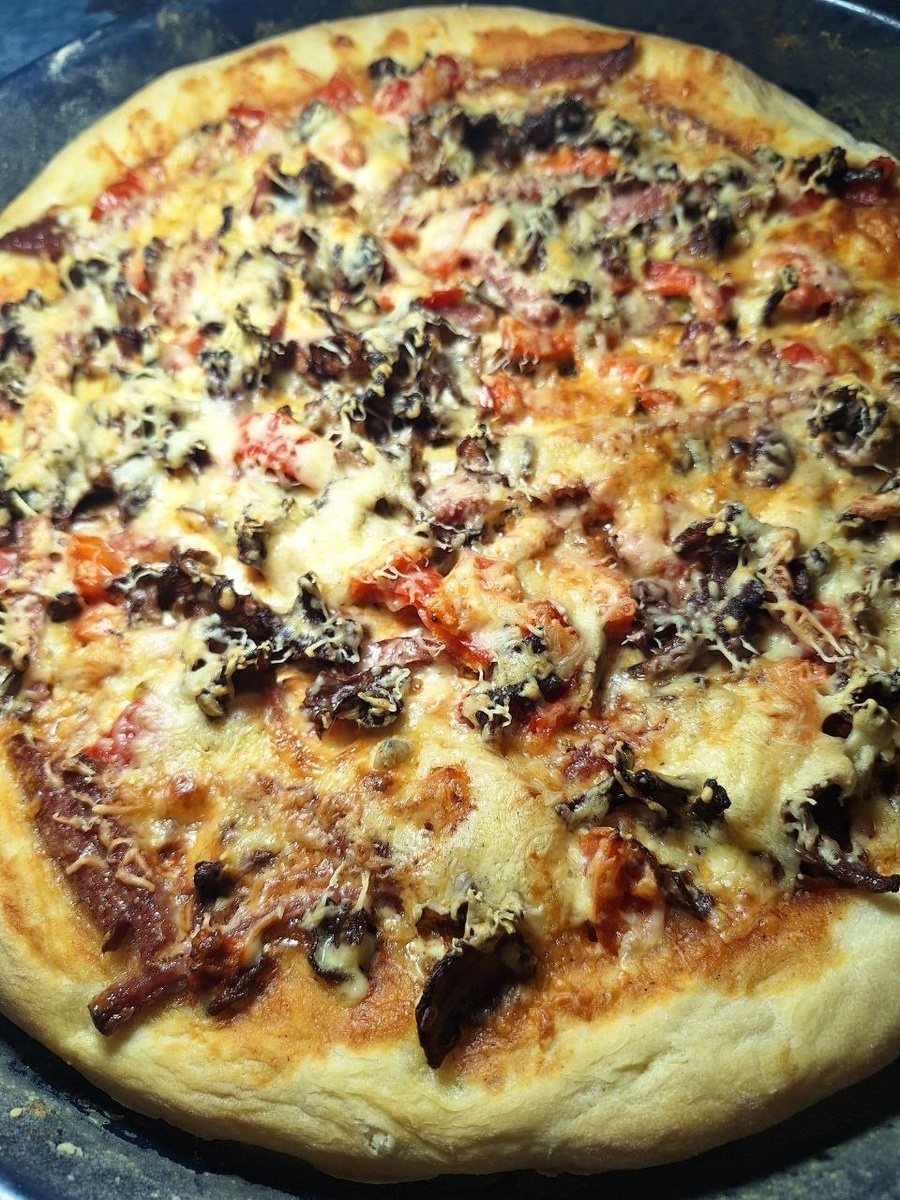 В теплую воду добавляем сахар, дрожжи и все перемешиваем. Добавляем муку и соль, перемешиваем. Добавляем оливковое масло и замешиваем тесто - оно должно получиться мягкое и эластичное. Смазываем оливковым маслом ёмкость, куда положим тесто, накрываем пленкой или крышкой и оставляем в теплом месте на 1 час. Затем тесто делим на две части ( я не делила и приготовила одну большую пиццу ), раскатываем на столе, присыпанным мукой, при помощи скалки переносим в форму, делаем бортики, протыкаем тесто вилкой и оставляем на 30 минут, накрыв полотенцем. Затем дно пиццы смазываем томатным соусом и выкладываем любую начинку. Выпекаем в заранее разогретой до 200 гр духовке примерно 10-15 минут. Пеките с удовольствием!