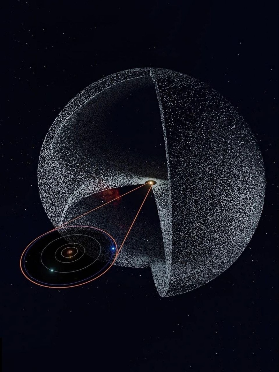 🌌 Мы привыкли видеть Солнечную систему как плоский диск из планет, но это лишь её центральная, небольшая часть. За орбитой Нептуна открываются огромные, темные пространства: сначала пояс Койпера, полный астероидов и карликовых планет (и, возможно, чего-то ещё загадочного), а за ним — облако Оорта. Оно выглядит как гигантский пузырь из пыли, льда и миллиардов комет. Его внешняя граница почти 100 000 раз дальше от Солнца, чем Земля, и свет долетает до неё целый год. 🌠 То есть наша Солнечная система вовсе не плоская — она шарообразная, гигантская и полна тайн, которые мы только начинаем понимать. 🪐✨ Magic Universe 🌌