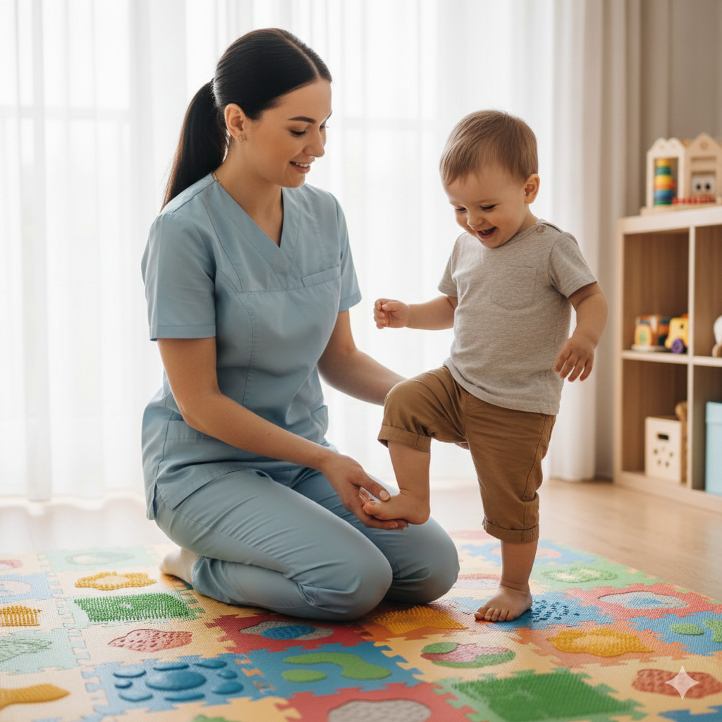 Здравствуйте, дорогие родители! На связи Юлия Рязанова, профессиональный детский массажист. С 2009 года я помогаю малышам расти крепкими и ровными, и тема вальгуса — мой «профильный» вопрос. Часто мамы спрашивают: «Юлия, посмотрите, у нас пятки «уехали» в стороны, это пройдет само?». Как мама двоих детей и специалист с 15-летним стажем, отвечу честно: само проходит редко. Стопа — это фундамент всего скелета. Если фундамент «поплыл», со временем полетят колени, тазобедренные суставы и осанка. Вальгусная деформация — это когда при плотном прижатии коленей друг к другу расстояние между внутренними лодыжками составляет более 4–5 см. Визуально ножки напоминают букву «Х», а стопы как бы распластываются по полу. Многие винят плохую обувь, но корень проблемы обычно глубже: Одной ортопедической обуви мало. Более того, жесткие ботинки часто просто «держат» ногу, но не заставляют мышцы работать. Нужна тренировка! 1. Лечебный массаж (Курс 10–15 сеансов)