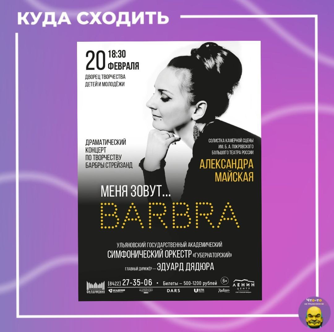 "✨ Солистка Камерной сцены имени Б. Покровского Большого театра России Александра Майская в моноспектакле, вдохновлённом автобиографией Стрейзанд, пропускает все вокальные миниатюры концерта через себя, превращая песни Барбары в свою собственную исповедь. Негромкое, вполголоса, задушевное исполнение, будто плывущее по волне нежности, сменяется мощным форсированным звуком, а затем переходит в философские раздумья о жизни и судьбе. 📅Когда: 20 февраля в 18:30 📍Где: во Дворце творчества детей и молодёжи (ул. Минаева 50) #куда_пойти_ул