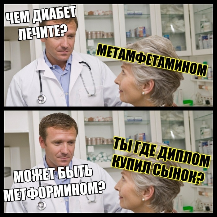 Вчера консультировал очень пожилую женщину с таким же пожилым диабетом и повторил ситуацию из мема. Спрашиваю, что принимаете, что принимали: «Ну, доктор, сначала был метамфетамин. Потом он перестал работать и сын мне купил морфин». Сын, к слову, тоже был на приеме и при этих словах глаза его расширились до размеров потенциального уголовного дела. Но я калач тертый. Спрашиваю (с надеждой): «вы, наверное, имели в виду метформин и форметин*? * Лекарства от диабета. Она: «ну да, сынок, да, это я и говорю». Прослушивающие на другом конце провода сразу расслабились.. Пост автора drgrdolgushin. Читать комментарии на Пикабу.