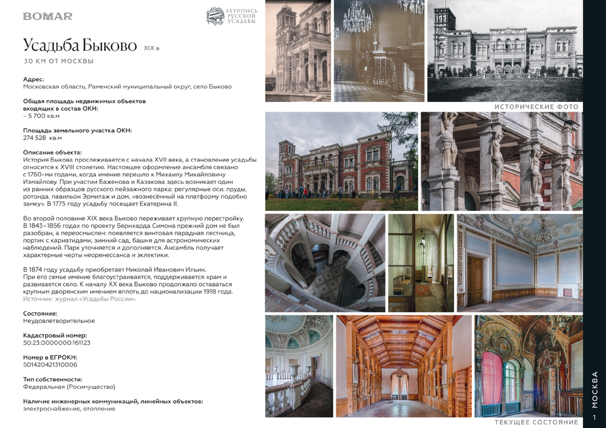 Праздничный январь закончился, а это значит - настало лучшее время для публикации делового контента. Совсем скоро нас ожидает важное событие: 16 февраля стартуют торги по усадьбе Быково. Надеемся, что самая известная подмосковная усадьба найдёт своего нового хозяина! Ну а пока мы с партерами из архитектурного бюро "BOMAR" представляем вам вариант концепции приспособления усадьбы Быково. Она выполнена в рамках нашего совместного проекта, который направлен на поддержку заброшенных усадеб и инвесторов, интересующихся наследием. Мы покажем вам, как объект может выглядеть после реставрации ещё задолго до того, как вы задумаетесь о разработке концепции его приспособления. Ведь мы точно знаем: лучше один раз увидеть и оценить потенциал объекта, чем просто знакомиться с сухими техническими данными! Все проекты "BOMAR" с любовью и вниманию к деталям разработаны специалистами с реальным опытом работы со множеством ОКН, что делает их не просто картинками, а жизнеспособными стратегиями. Как вам к
