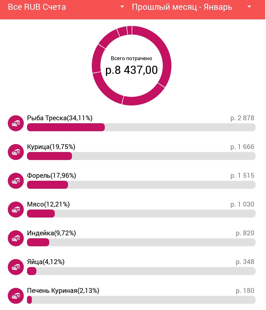 Заметно, что сильно возросли расходы на мясные продукты. Это к вопросу о том, что на готовую еду много денег уходит. Угу, как будто мясо и курицу бесплатно кулинарам раздают.