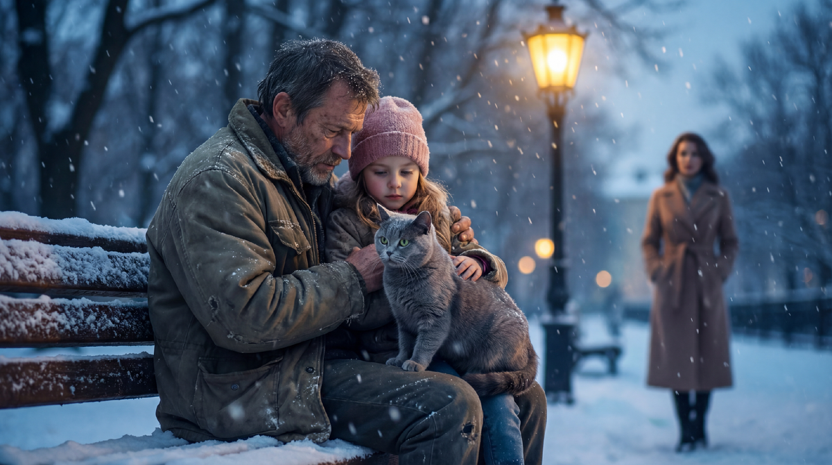 Они замерзали. Это было видно по всему: по тому, как мужчина пытался закрыть ребёнка своим телом, по синеватым губам девочки, по инею на усах кошки. Даже животное понимало – прижималось к девочке, пряча нос в её куртку.