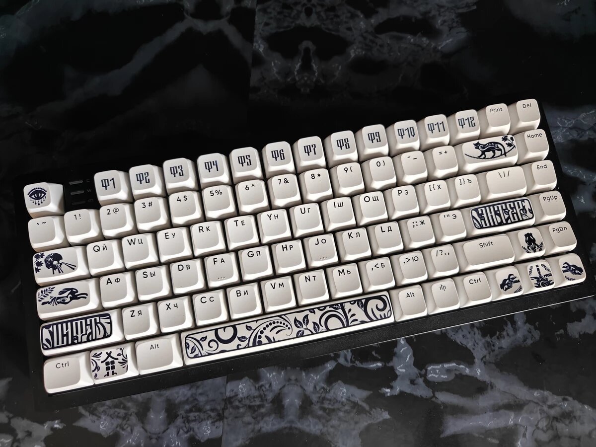 Кому-то “славянский” принт кажется находкой (и именно тем, что выделяет клавиатуру на фоне однотипных устройств), а кому-то — раздражает. И тут редкий случай, когда производитель как будто заранее предусмотрел конфликт вкусов, положив более нейтральные колпачки в комплект. 10