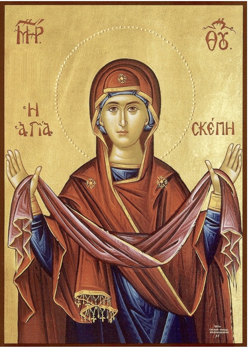 Ветия многовещанныя, яко рыбы безгласныя, недоумеют, како восхвалити по достоянию великий всечестнаго Покрова Твоего праздник: вся бо о Тебе от них глаголемая не суть довольна к единому исчислению щедрот Твоих. Мы же, Твоя неисчетная благодеяния видяще, с веселием взываем: Радуйся, от язвы и всегубительства смертнаго нас соблюдающая; радуйся, от внезапнаго колебания земли грады и веси сохраняющая. Радуйся, от разлияния вод и потопления рукою крепкою возводящая; радуйся, от запаления огненнаго росою молитв Твоих избавляющая. Радуйся, от глада душевнаго и телеснаго Хлебом Жизни снабдевающая; радуйся, удары молнии и грома от главы нашея отводящая. Радуйся, от нашествия иноплеменник и тайных убийц спасающая; радуйся, от домашния брани и вражды единокровных миром и любовию ограждающая. Радуйся, Радосте наша, покрый нас от всякаго зла честным Твоим омофором.