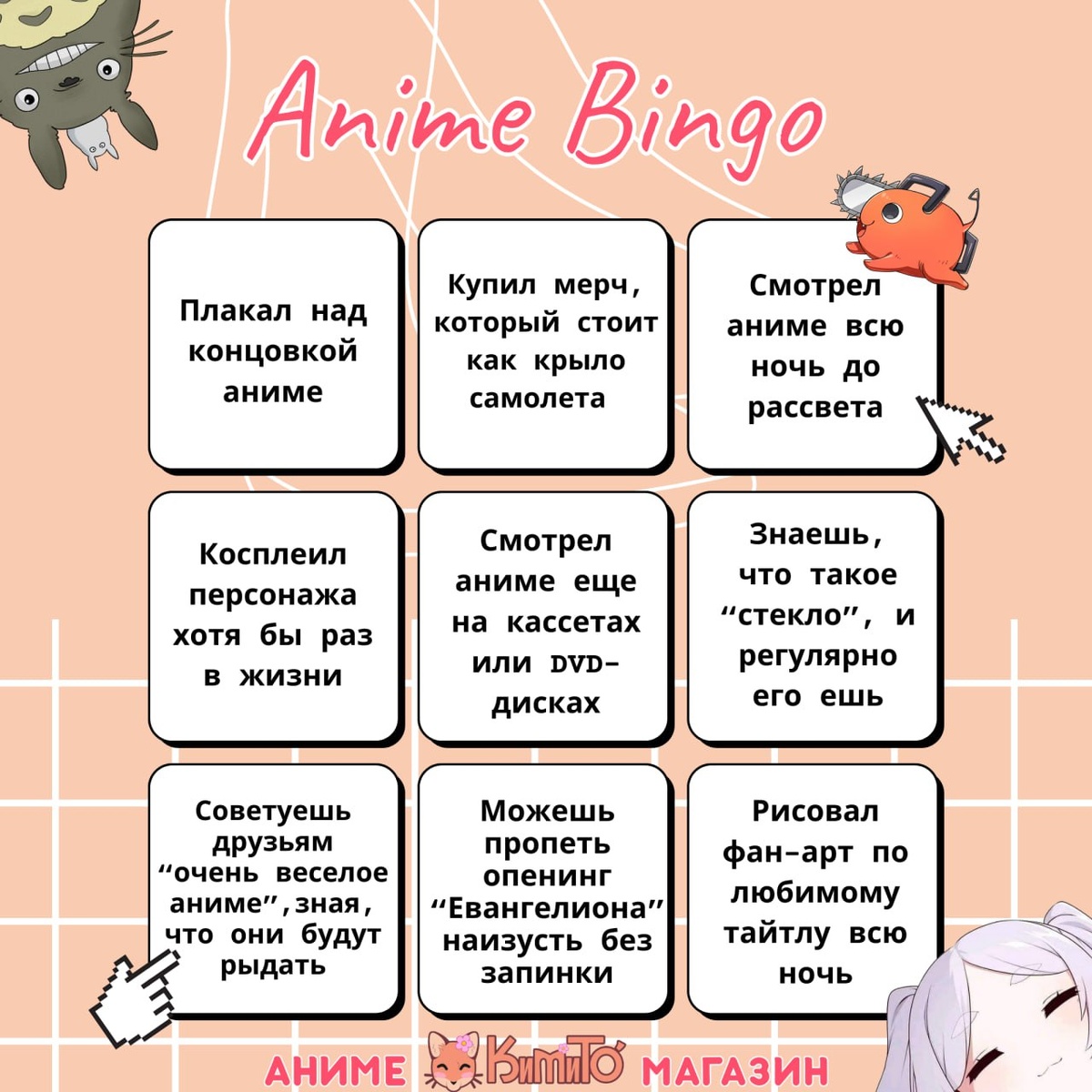 🔸🔸🔸🔸🔸🔸🔸 Ребята-котята, а давайте проверим, насколько глубоко вы погрязли в мире аниме? 😂 Мы составили небольшое Бинго! Отмечайте, что про вас, и делитесь результатами в комментариях! Сколько пунктов совпало у вас? Ждем тебя с 10:00 до 20:00 г. Саратов, Ул. Волжская 27а г. Энгельс, ТЦ Облака KimiTo - Твой Аниме магазин!❤️