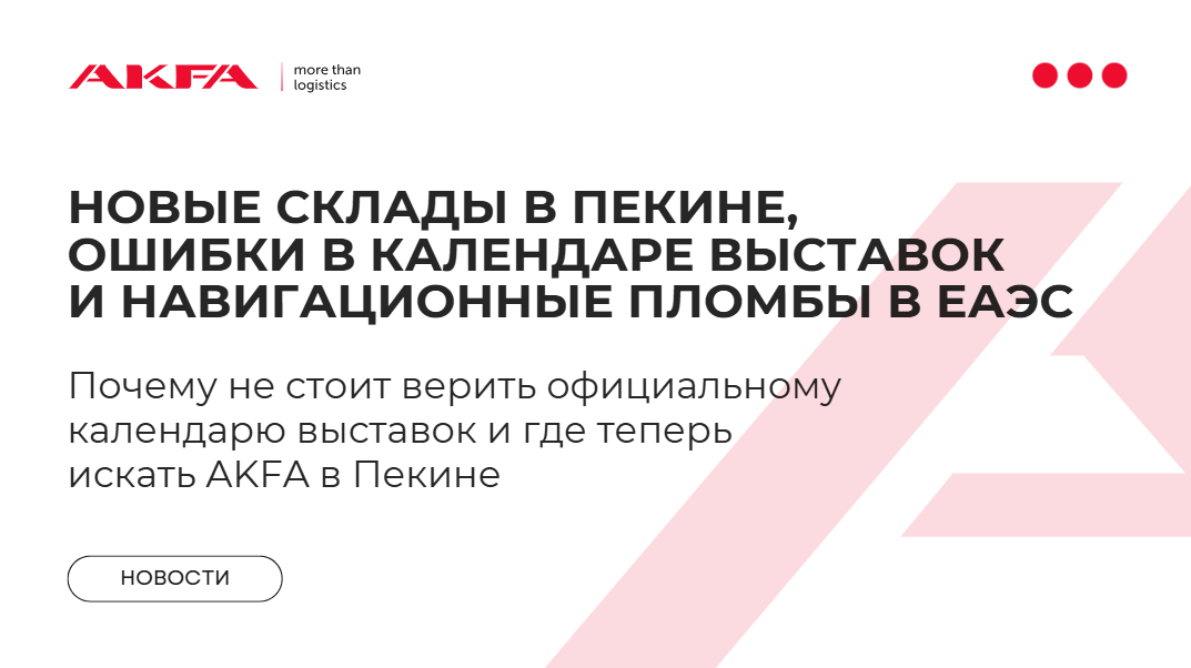 Дайджест от AKFA — подборка главных инфоповодов, которые помогут вам оставаться в курсе событий и всегда быть на шаг впереди. Читайте telegram-канал @akfa_logistic и будьте среди первых! Друзья, у нас важные новости! Чтобы сделать логистику еще удобнее, мы обновили адреса наших складских мощностей в столице КНР. Работа продолжается в обычном режиме, но просим использовать новые данные при оформлении заказов. Обновите информацию в своей базе и оперативно уведомите поставщиков. Контакты наших китайскоговорящих сотрудников и подробные иероглифы для отправки доступны на нашем сайте: akfa.ru Торгпредство РФ опубликовало список мероприятий, но мы советуем не спешить с билетами. Наши эксперты нашли в документе критические неточности, которые могут сорвать вашу командировку. Формат классических выставок угасает, а «качество» участников падает. Сверяйте даты на официальных сайтах организаторов или доверяйте тем, кто работает в Китае ежедневно. Наш стратегический партнер, группа FESCO, расширила