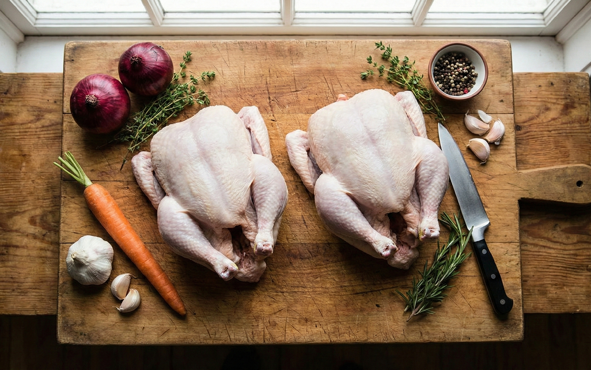 Вы когда-нибудь смотрели на огромный пакет с продуктами с мыслью: «И что мне теперь с этим делать?». Сегодня мы превратим этот хаос в идеальную систему. Всего две куриные тушки, немного времени — и ваш холодильник забит полуфабрикатами, а голова свободна от вопроса «что приготовить на ужин». Мы не просто режем мясо, мы создаем стратегический запас. Никаких костей в мусорку — всё пойдет в дело, от наваристого бульона до нежнейшего филе. Шаг 1. Глобальная разделка Кладем курицы (2 шт.) на доску. Наша задача — разобрать их на запчасти. Шаг 2. Маринуем голени (Ужин «здесь и сейчас») В миску к голеням (4 шт.) добавляем: Шаг 3. Заготовка «Бедра в травах» (В морозилку) Берем мякоть бедер (4 шт.). Обязательно обсушиваем их бумажным полотенцем. Складываем в миску. Добавляем: Шаг 4. Филе №1: Основа для «Рубленых котлет» (В холодильник) Берем филе (2 шт.). Нарезаем мелким кубиком (1х1 см). Складываем в контейнер. Шаг 5. Филе №2: Основа для «Фрикасе» (В морозилку) Берем оставшиеся филе (2 шт.).