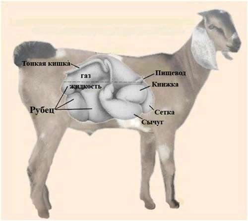 Если коза вздута, то сначала ставим её свечкой, следим, чтобы не западал язык, содержимое рубца уйдёт вниз, а хотя бы часть воздуха должна выйти. Для выхода воздуха можно потянуть козу за язык.