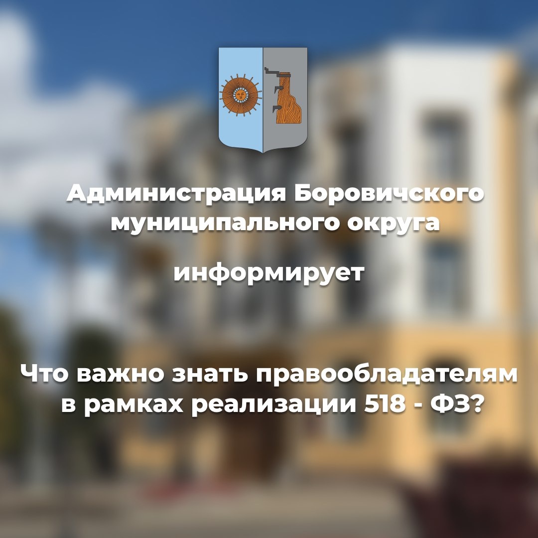 по выявлению правообладателей ранее учтенных объектов недвижимости. 📝 В прикрепленной памятке расположена информация на тему: «Что важно знать правообладателям в рамках реализации 518 - ФЗ?» Также подать заявление на регистрацию ранее возникшего права могут и органы местного самоуправления. Для этого Вам необходимо обратиться в комитет архитектуры и имущественных отношений Администрации Боровичского муниципального района с документами, удостоверяющими личность, и документами на объект недвижимости или земельный участок (г. Боровичи, ул. Коммунарная, д.48, каб. 46, тел. (81664)-91-211).