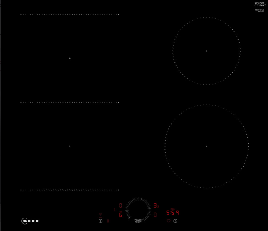 Индукционная варочная панель Neff T56FHS1L0 выполнена в сдержанном минималистичном дизайне и рассчитана на аккуратную интеграцию в современную кухню. Чёрная стеклокерамическая поверхность со скошенным передним краем визуально облегчает рабочую зону и подчёркивает чистоту линий. Модель предназначена для установки над столешницей и хорошо сочетается как с классическими, так и с современными кухонными гарнитурами. Панель оснащена четырьмя индукционными зонами нагрева. Две левые зоны могут объединяться в CombiZone, образуя единое пространство для крупной или нестандартной посуды — утятниц, грилей, продолговатых кастрюль. Система автоматически распознаёт наличие и положение посуды, поэтому нагрев активируется только в зоне контакта. Это повышает эффективность и исключает бесполезный расход энергии. Для точной настройки предусмотрено 17 уровней мощности, что позволяет одинаково уверенно работать и с деликатными блюдами, и с интенсивной жаркой. Выбранный уровень отображается цифровой индикаци