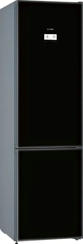 Bosch KGN39LB30U — полноразмерный двухкамерный холодильник с нижним расположением морозильной камеры, ориентированный на большие объёмы хранения и стабильную работу без ручного обслуживания. Модель выполнена в формате отдельно стоящей техники и рассчитана на установку в стандартную нишу шириной 60 см. Корпус с фасадом из чёрного стекла смотрится строго и аккуратно, без визуального перегруза, при этом поверхность практична в повседневной эксплуатации. Одна из ключевых особенностей модели — вместимость. Общий полезный объём составляет 366 литров, из которых 290 литров приходится на холодильную камеру и 110 литров — на морозильную. Это формат, рассчитанный на активное хранение продуктов без необходимости жёстко экономить пространство. В холодильном отделении установлено пять полок, три из них регулируются по высоте. Есть выдвижные полки EasyAccess, которые позволяют быстро получить доступ к продуктам, размещённым в глубине. На дверце — четыре полноразмерные полки, включая отделения под бу