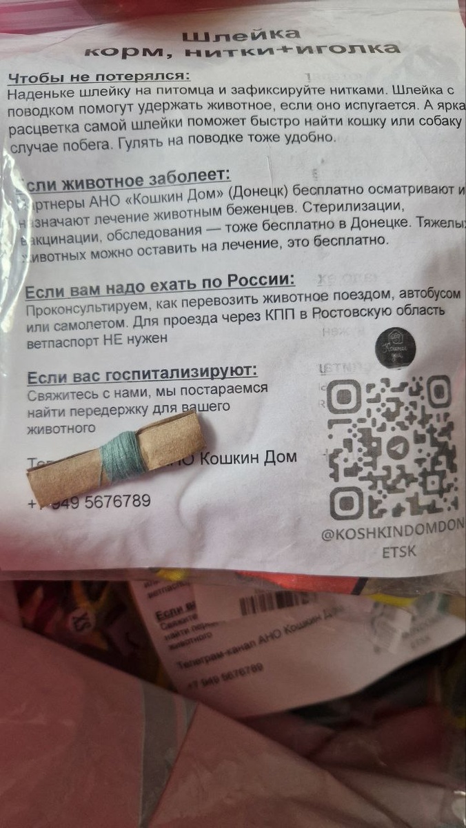 Вы на канале АНО Кошкин Дом Донецк. Это проект спасения животных с линии фронта, волонтёры вывозят кошек и иногда собак в Донецк, где лечат и потом стараются их пристроить. А также делают много другого важного и полезного. Да, и такое мы передаём в ПВР, казалось бы, зачем? Очень надо, поверьте, Каждая шлейка - это надёжно зафиксированный кот, которому вместе с людьми-беженцами долгое время перемещаться. И вот уже третью партию шлеек сегодня передадим в распределительный пвр. Туда доставляют людей, вышедших к точке эвакуации из Красноармейска и Димитрова. Много километров ослабленные люди идут пешком - заехать эвакуационной бригаде невозможно. Сегодня и ближайшие дни лютый мороз. Донбасский степной ветер в состоянии обморозить даже при -5, а не то, что при -15 -19, как будет в эти дни. Наша задача - обеспечить людей шлейками, чтобы можно было в помещении безопасно вынуть питомца из переноски или сумки, дать им корм, пеленки и оставить наши контакты на случай ветеринарной или иной помощи
