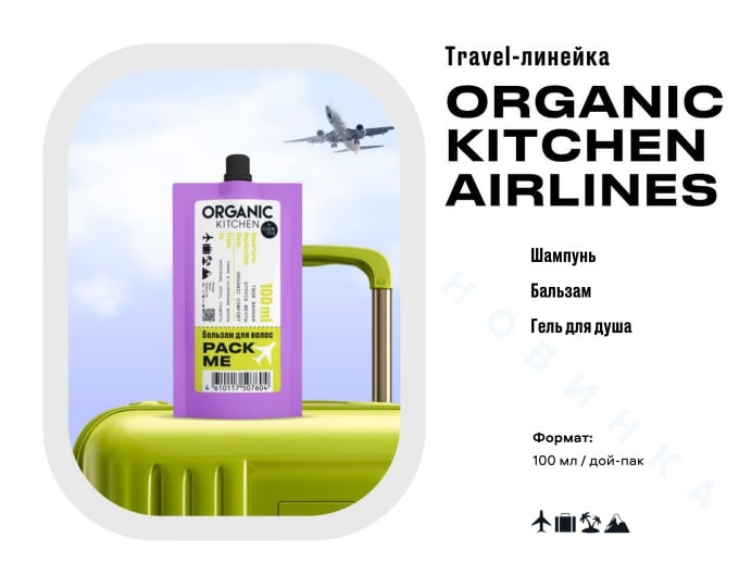 Travel-линейка «ORGANIC KITCHEN AIRLINES»: шампунь, бальзам, гель для душа.