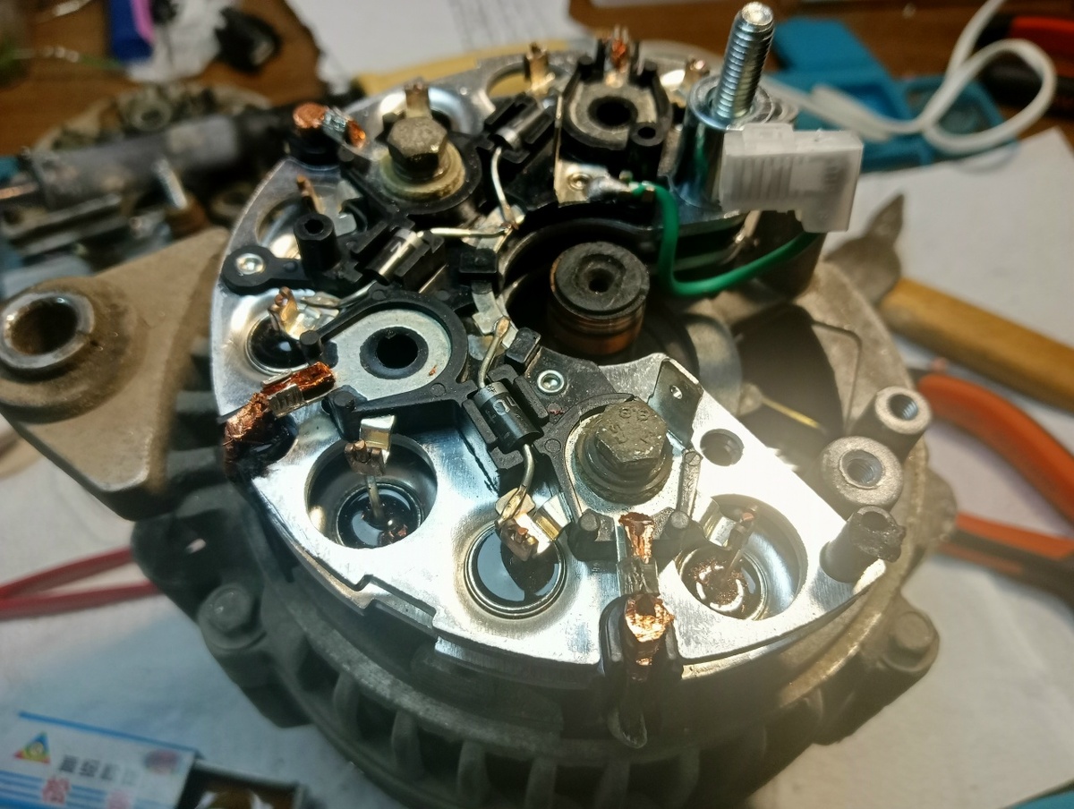 Поиск подходящих ремонтных деталей привёл владельца к диодному мосту, очень похожему на оригинальный. Однако, к сожалению, зажимы для крепления обмотки генератора оказались слишком короткими, что делает его неподходящим.