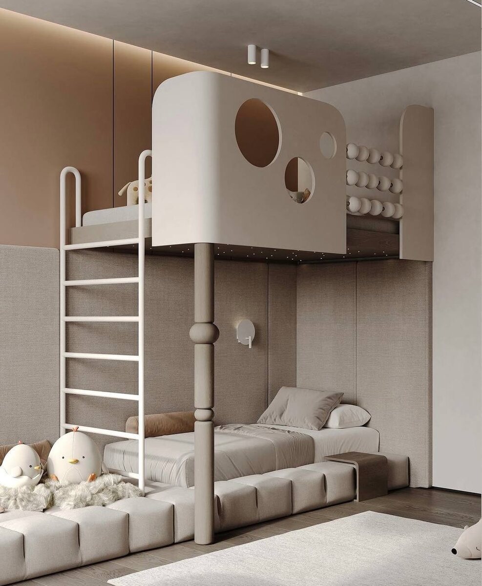 ✨❤️ В этой детской будет жить совсем еще малышка — спать в южной кровати на первом уровне и играть с любимыми игрушками на втором этаже 🌝 Отдельного внимания заслуживает система хранения — открытые и закрытые ящики поместят все игрушки и личные вещи девочки 🌺 #детскаядлядевочки #детскаядляодного #детскаядляребенка
