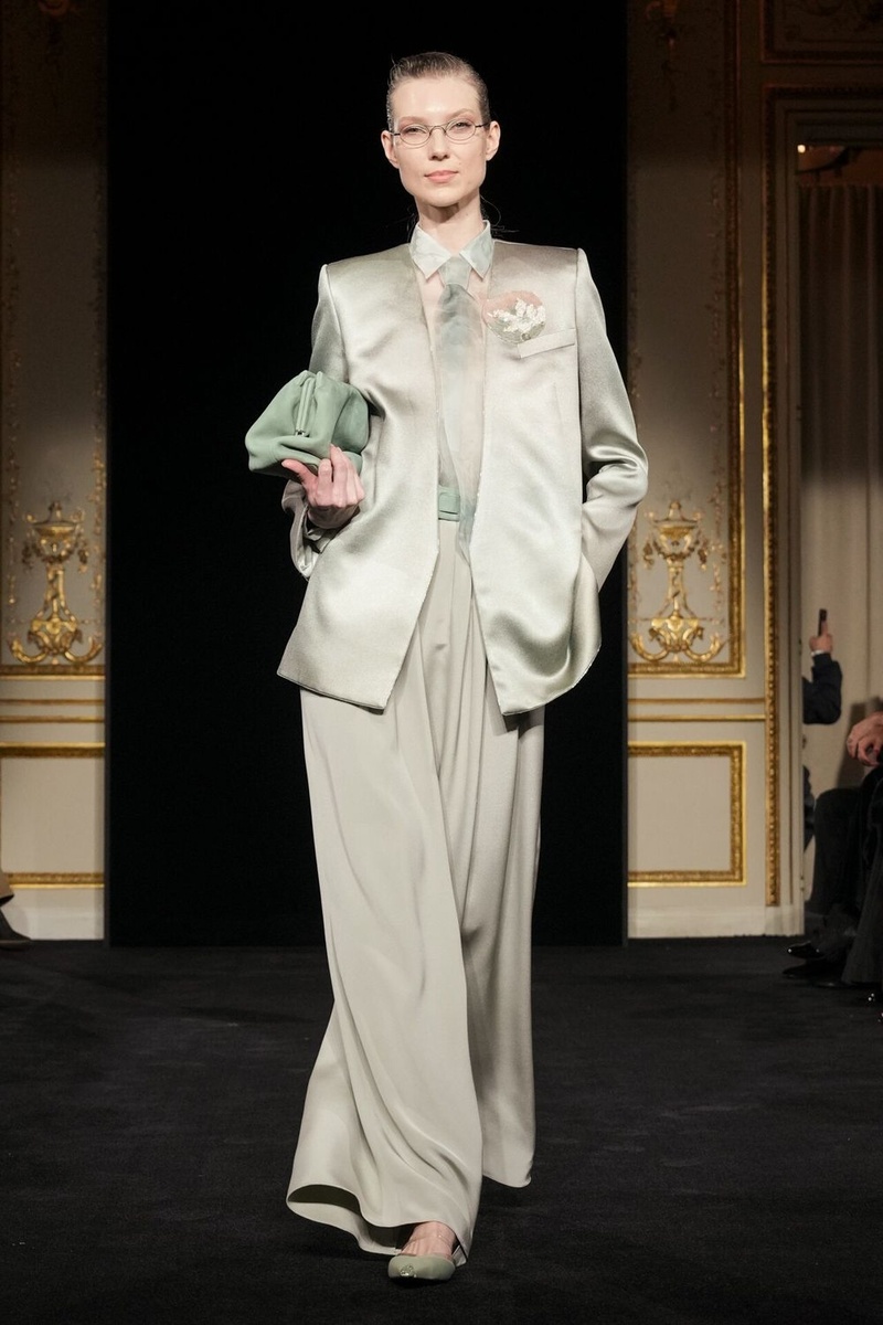Без громких заявлений. Без желания «переписать историю». Очень по-арманьевски. Показ прошёл в Палаццо Армани в Париже — камерно, спокойно, почти по-домашнему. И это сразу задало тон всей коллекции. Здесь не было театра и желания удивить любой ценой. Было другое — уверенное спокойствие. Первые образы сразу дали понять: Armani остаётся Armani. Плавные линии, мягкий крой, приглушённые цвета. Чёрный — как основа, пастельные и нефритовые оттенки — как дыхание. Коллекция даже получила название «Нефрит» — камень, который символизирует гармонию и защиту. Очень точное попадание в настроение показа