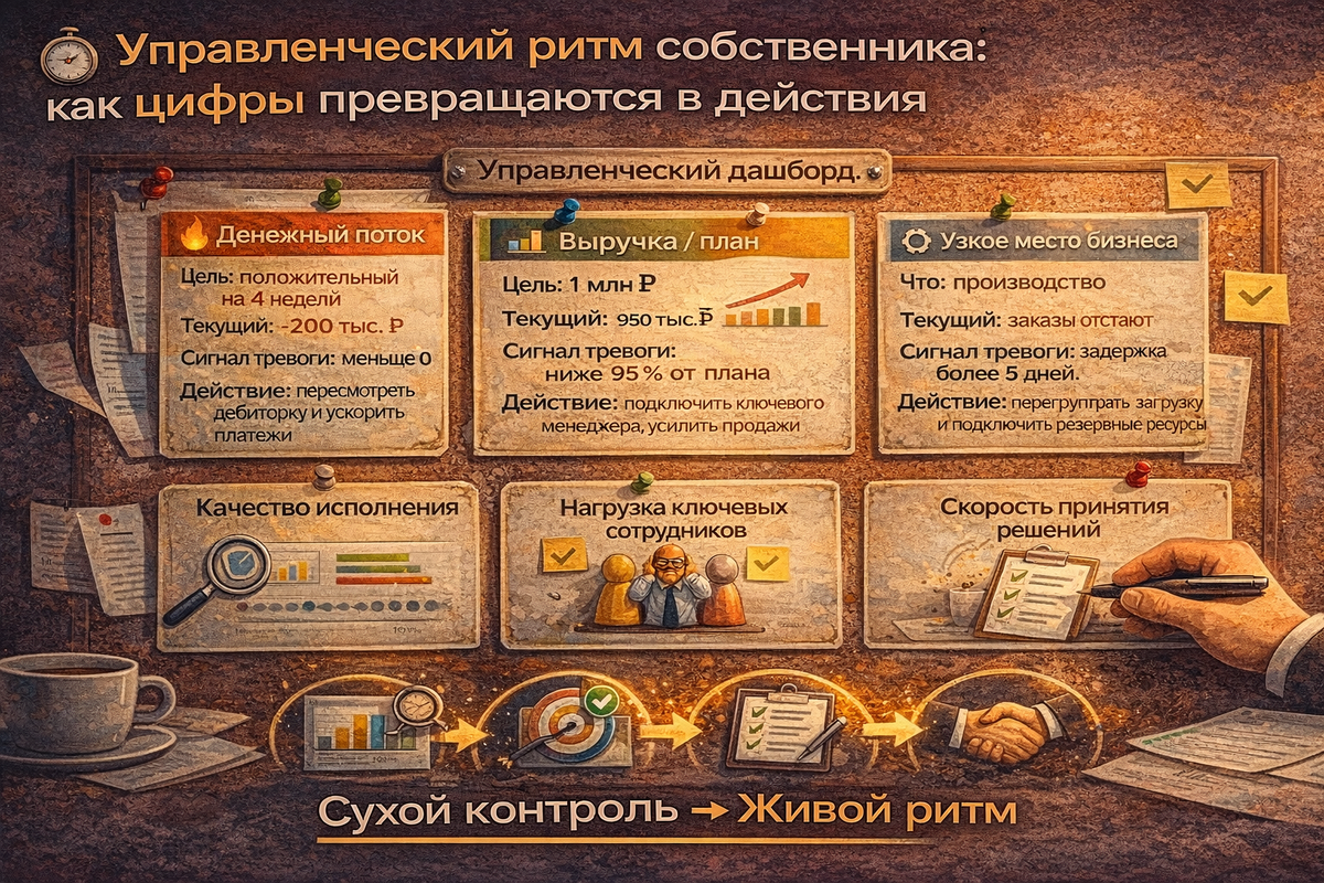 Но без ритма — регулярного системного подхода — даже правильные показатели не дают действий. Собственник часто думает: «Цифры есть — значит, я в курсе». Но это иллюзия контроля. Это регулярная последовательность действий, в которой показатели превращаются в решения: И повторяем ежедневно или еженедельно, в зависимости от скорости бизнеса. Вместо таблицы — короткие блоки по каждому показателю.