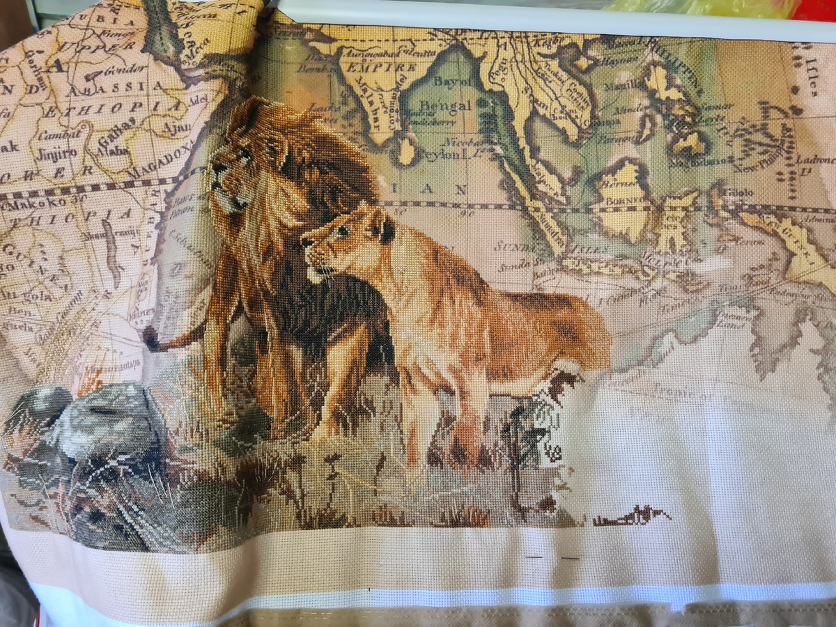 За окном – сибирские крещенские морозы, под -40. А в доме – тепло, треск дров в печке и гипнотизирующий танец огня за стеклом. Именно в такие вечера я наконец-то заканчиваю своего главного «творческого долгостроя» – большую вышивку со львами на карте мира.