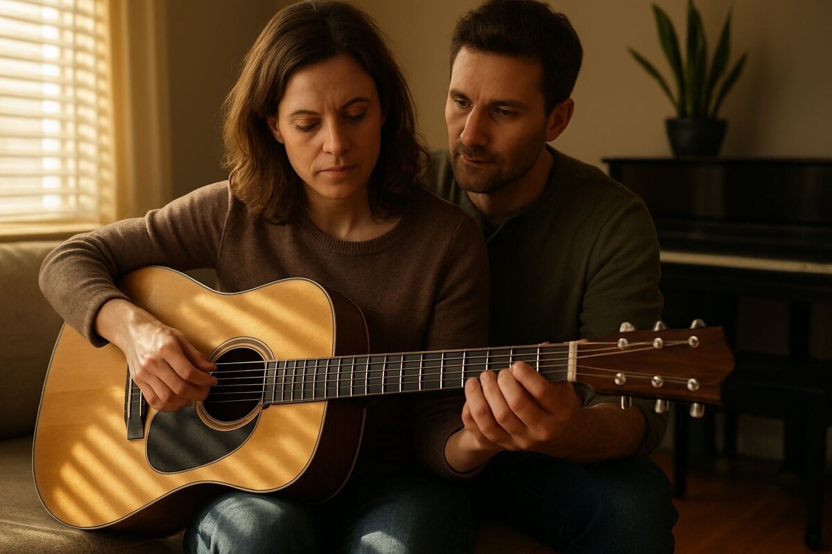 Он встал позади неё, осторожно поправил положение её пальцев на ладах. Его руки были уверенными, но не навязчивыми. Запах его одежды — свежей хлопковой ткани и лёгкой древесной туалетной воды — смешался с ароматом кофе.