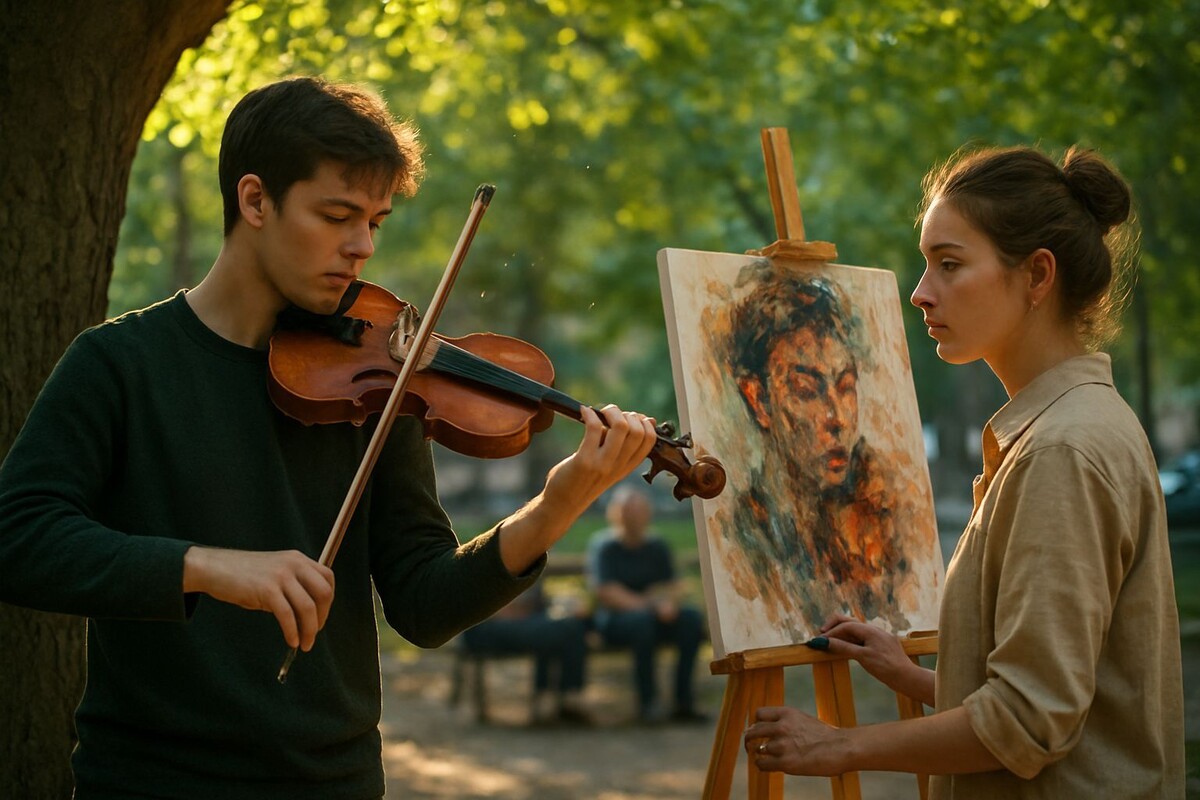 Её взгляд скользил по линиям его фигуры — согнутая спина, локоть, отведенный в сторону, резкая тень от смычка. Она смешивала на палитре охру и умбру, пытаясь поймать не лицо, а энергию. Звуки скрипки становились мазками: высокие ноты — это блики на струнах, низкие — глубокие тени под деревьями на площади. Они никогда не обменивались словами. Их диалог был соткан из минорных гамм и цветовых аккордов.