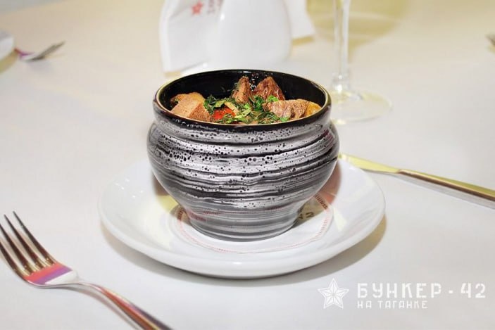 В ресторане «Бункер-42» вы можете насладиться превосходным жаркое «Русское» - сочная говядина в горшочке, которая буквально тает во рту.