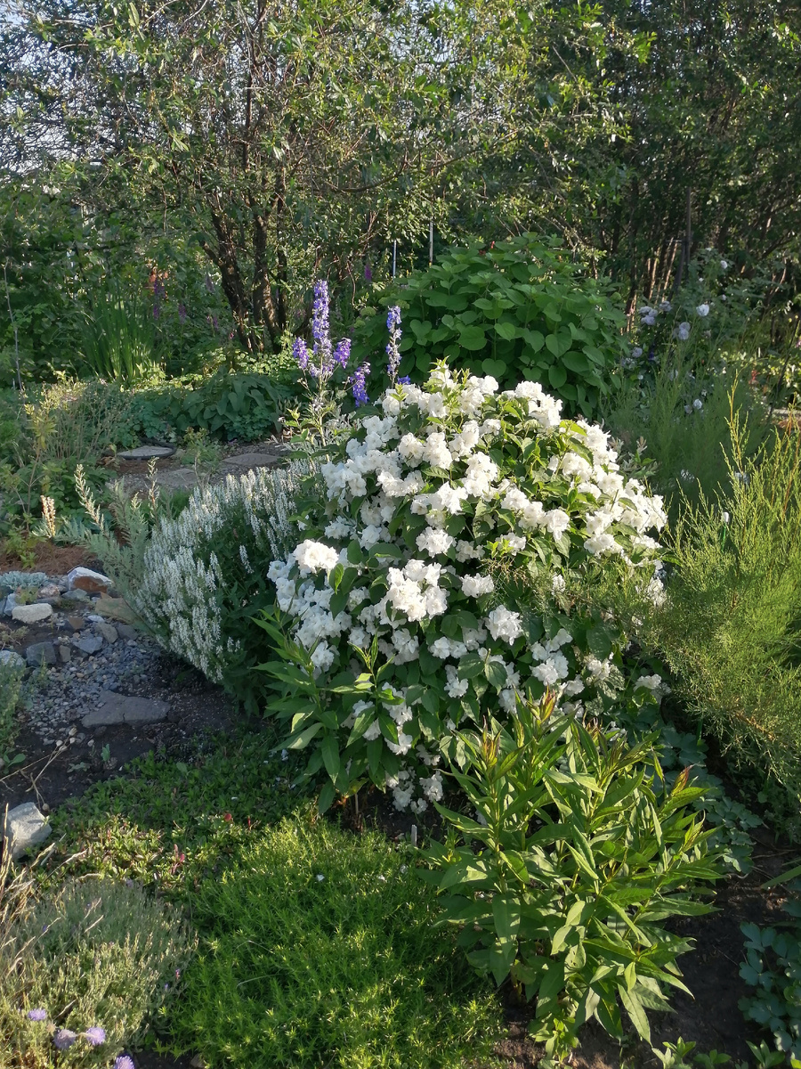 Наткнулась на летних фотографиях и внезапно подумалось, что написать про него стоит. Нет, шалфеи "стандартного" цвета, безусловно, хороши. Но цвет тот все-таки несколько обязывает. А шалфей белый в какой-то степени универсален. Его можно и туда посадить, и сюда, и вообще везде. Потому что он практически везде будет уместен. Вот он, так сказать, белым на белом, подпевая чубушнику: Чубушник, надо сказать, в прошлом году на цветение как-то не расщедрился, обычно он цветет куда как обильнее, так что шалфей рядом очень в тему пришелся. И это (я про шалфей) куст всего-то навсего второго годика жизни. То есть разрастается он очень быстро, куст дает объемный, высотой тоже не обижен - как мне кажется, те 50 см, которые ему дают питомники, возьмет влегкую. Насчет того, разваливается ли - есть маленько, это вам не Карадонна какая. Но я по этому поводу никогда не страдаю, а просто беру шпагат, обматываю им любой куст, хоть шалфей, хоть пион, хоть чубушник, хоть гортензию, и вопрос снимается. По кр