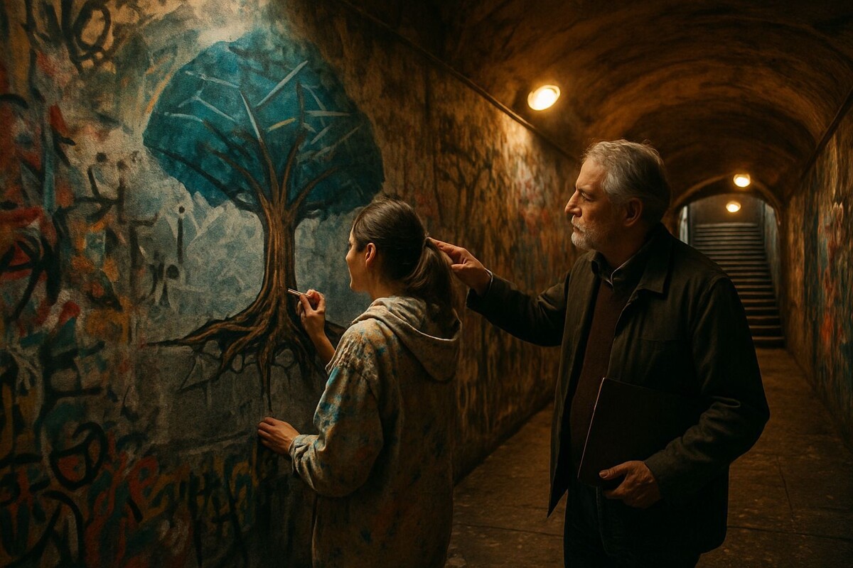 Они придумали проект «Диалог поколений». На свободном участке стены, который Лена когда-то зачернила, появилась новая работа. Петр нарисовал контур — старый дуб с мощными корнями, уходящими в трещины бетона. Лена заполнила его крону яркими современными узорами. Корни были коричневыми, землистыми, а листья — неоново-зелёными, футуристичными.