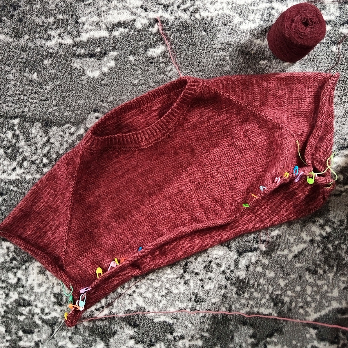 Когда довязываю до нужного места разворота (их я предварительно отмечаю маркерами), вязание разворачиваю, и первую петлю снимаю как простую кромочную, без накида или обвития, и вяжу дальше следующий ряд.