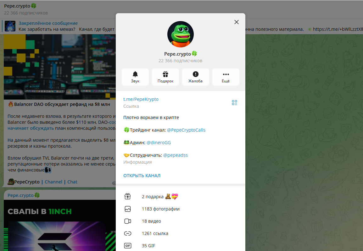В Telegram хватает криптоканалов, которые выглядят бодро и привлекательно: мемы, активный админ, торговые идеи и ощущение живого комьюнити. Pepe.crypto🍀 как раз из этой категории. Более 22 000 подписчиков, разговоры про мемкоины, «плотную работу в крипте», отдельный трейдинг-канал и постоянная активность создают впечатление, что здесь действительно «шарят» и помогают зарабатывать. Но если смотреть не на эмодзи и вайб, а на реальную механику проекта, вопросов возникает больше, чем ответов. Для тех, кто предпочитает более спокойный и структурированный подход без мем-хайпа и резких движений, можно посмотреть альтернативу здесь: это проект с более прозрачной логикой и без агрессивной подачи. Формально Pepe.crypto🍀 подаётся как крипто-комьюнити, где публикуют: Также указана структура проекта: На словах — дружелюбное сообщество.