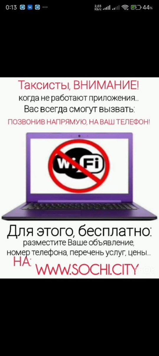 найти вас напрямую через интернет. Разместите бесплатно своё объявление на портале www.sochi.city Укажите в нём: · Ваш номер телефона · Виды услуг (трансфер, город, междугород) · Актуальные цены Почему это важно? Вас будут находить не только местные жители. Туристы, которые едут в Сочи из других городов, заранее ищут в интернете надежное такси для трансфера или поездок по городу. Ваше объявление увидят в поиске Яндекс и Google, и вам позвонят прямо на телефон, без комиссий посредников. Это ваш личный, работающий круглосуточно онлайн-офис. #Сочи #ТаксиСочи #ТрансферСочи #РаботаВСочи #ОбъявленияСочи #Таксист #АэропортСочи #ТуризмСочи #Пассажиры #ЧастныеПеревозки