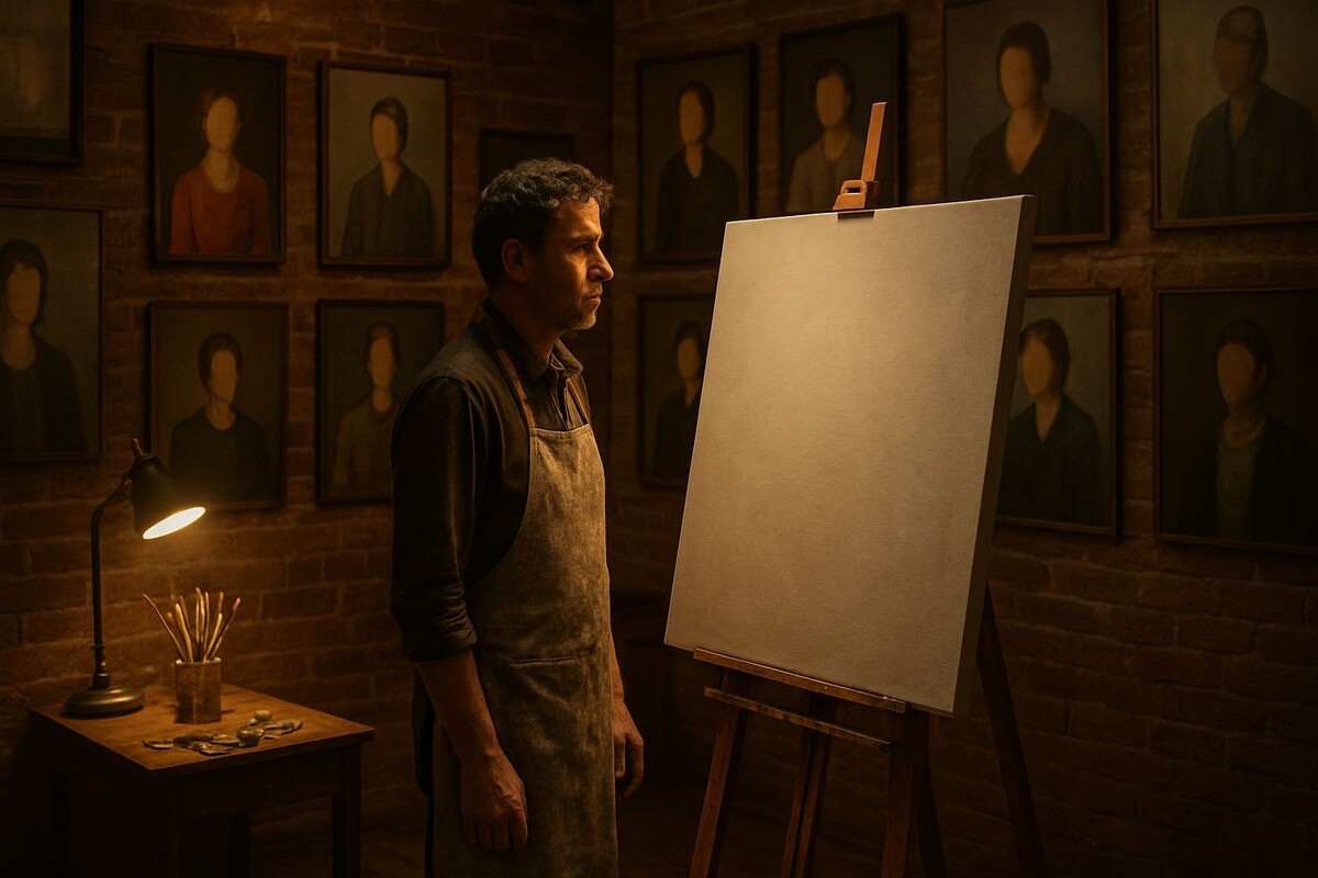 «Вы тот, кто рисует… без лиц?» — её голос был похож на звук треснувшего фарфора, тихий и осторожный.