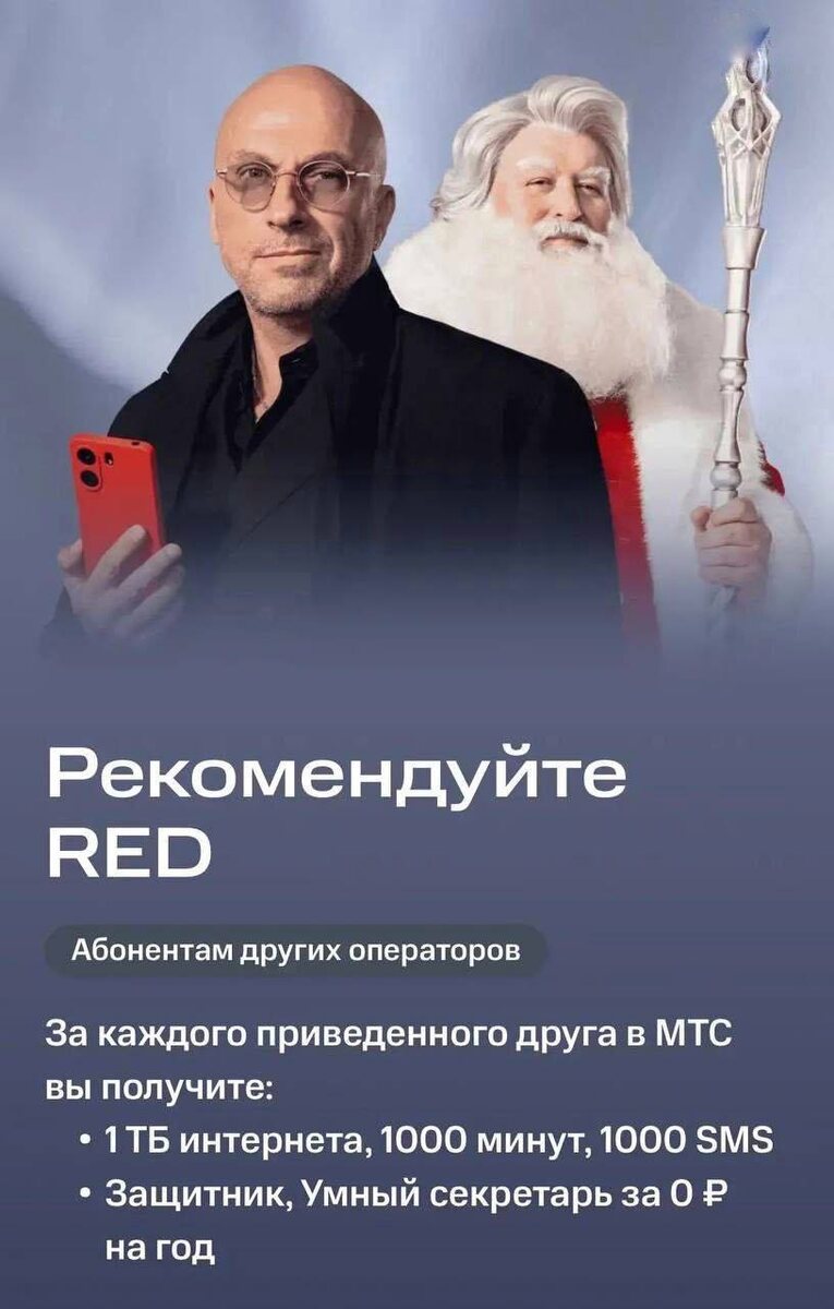 ! 🎁 Представьте: ваш друг переходит в МТС по вашей ссылке, сохраняя свой номер. В итоге он — на выгодном тарифе за 400 ₽ с безлимитным интернетом, 1000 минут и SMS. А вы получаете на целый год: 1 ТБ интернета, 1000 минут, 1000 SMS и голосовые сервисы VoiceTech. Это новая программа от МТС. Просто приглашайте друзей через приложение «Мой МТС» — выгода для вас обоих.