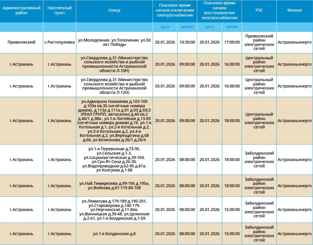 Рабочие будни в Астрахани продолжаются, а вместе с ними и плановые отключения электроэнергии. Как сообщили в компании «Россети Юг», временно без света останутся жители областного центра, а также Приволжского района. Под отключения попадет конкретно село Растопуловка. Подробный перечень адресов, где будет приостановлено электроснабжение, приведен ниже: А информацию обо всех коммунальных проблемах нашего города вы можете найти на этой карте. Здесь, в режиме реального времени, вы можете наблюдать за отключениями света, воды и т.д. Если возникли незапланированные отключения, можно обращаться по указанным контактным телефонам: Сообщение 20 января некоторые астраханцы на 10 часов останутся без света появились сначала на Астрахань.Ру последние новости региона.